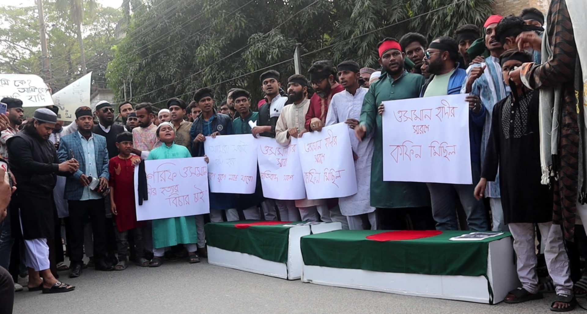 তুমি কে, আমি কে হাদি হাদি, হাদি ভাইয়ের রক্ত বৃথা যেতে দেবো না, খুনি ও হত্যার বিচার চাই, প্রশাসন জবাব চাই সহ বিভিন্ন স্লোগান দেন বিক্ষুদ্ধ জনতা।