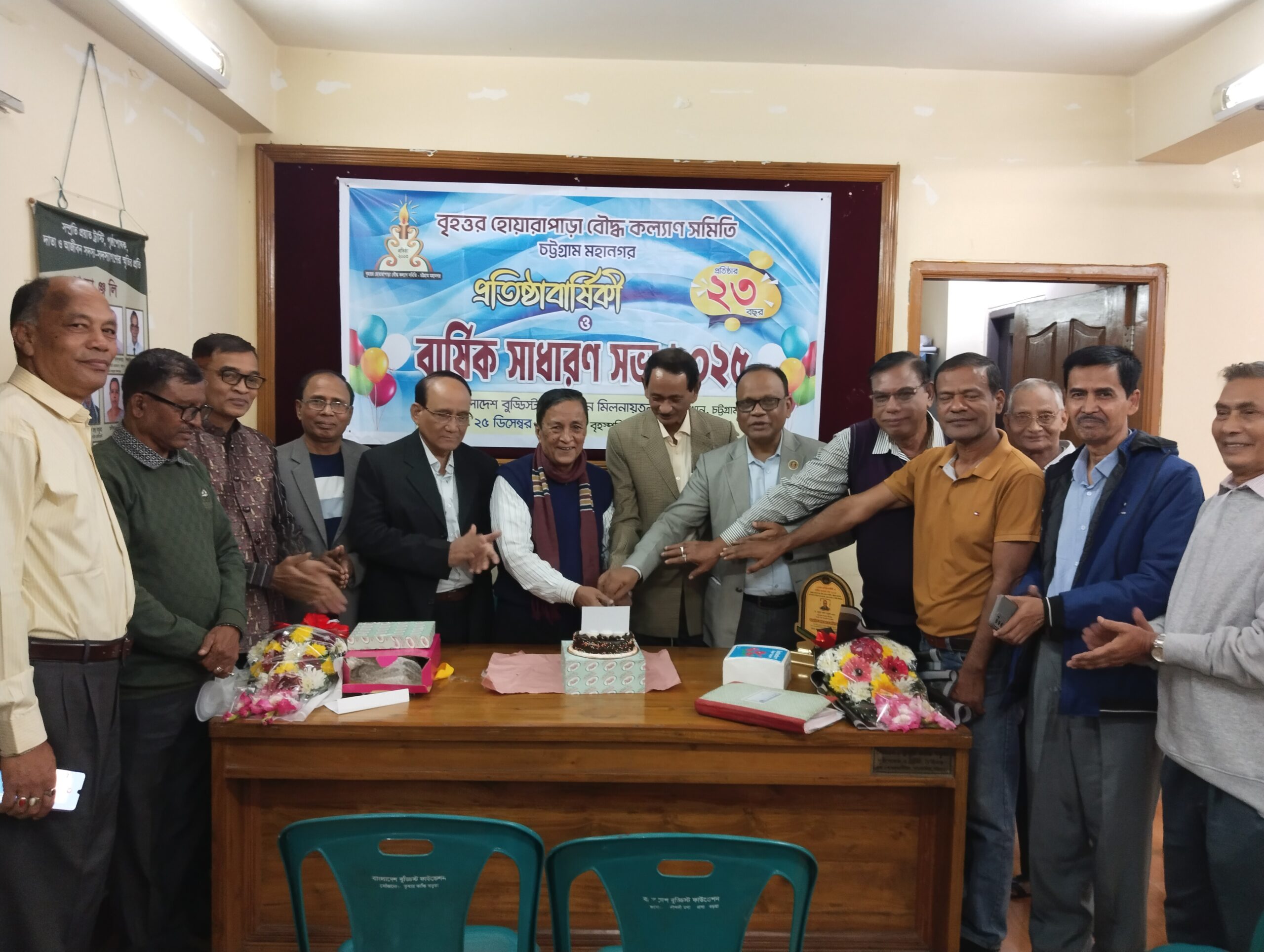 চট্টগ্রাম: বৃহত্তর হোয়ারাপাড়া বৌদ্ধ কল্যাণ সমিতি- চট্টগ্রাম মহানগর এর ২৩তম প্রতিষ্ঠাবার্ষিকী, সংবর্ধনা ও বার্ষিক সাধারণ সভা (বৃহস্পতিবার) ২৫ ডিসেম্বর, নগরীর বাংলাদেশ বুড্ডিস্ট ফাউন্ডেশন মিলনায়তনে অনুষ্ঠিত হয়। সংগঠনের সভাপতি ডা. অনিল কান্তি বড়ুয়ার সভাপতিত্বে অনুষ্ঠানে প্রধান অতিথি ছিলেন বাংলাদেশ বৌদ্ধ কৃষ্টি প্রচার সংঘের সহ-সভাপতি কমলেন্দু বিকাশ বড়ুয়া,