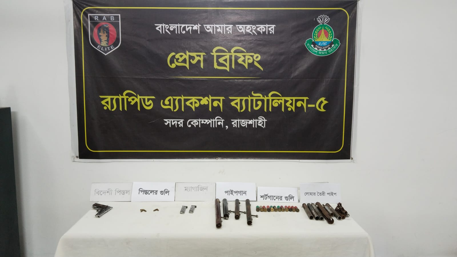 তানোরে র‌্যাবের ঝটিকা অভিযান: বিদেশি পিস্তল ও বিপুল পরিমাণ পাইপগান উদ্ধার