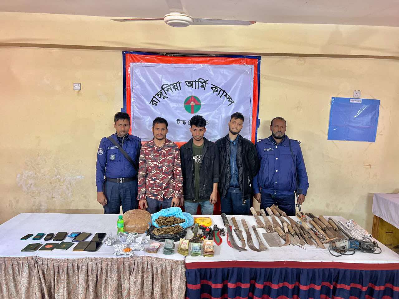 গ্রেফতারকৃতদের বাড়িতে তল্লাশি চালিয়ে ৮৮২ পিস ইয়াবা, ৩ কেজি ১০০ গ্রাম গাঁজা, দা, চাপাতি, রামদা, ছুরি, হাতুড়িসহ বিভিন্ন ধরনের দেশীয় অস্ত্র উদ্ধার করা হয়। এ ছাড়া ৩টি পাসপোর্ট, ৫টি স্মার্টফোন, ৪টি বাটন ফোন এবং নগদ ১ লাখ ৫ হাজার ৮৯০ টাকা জব্দ করা হয়েছে।