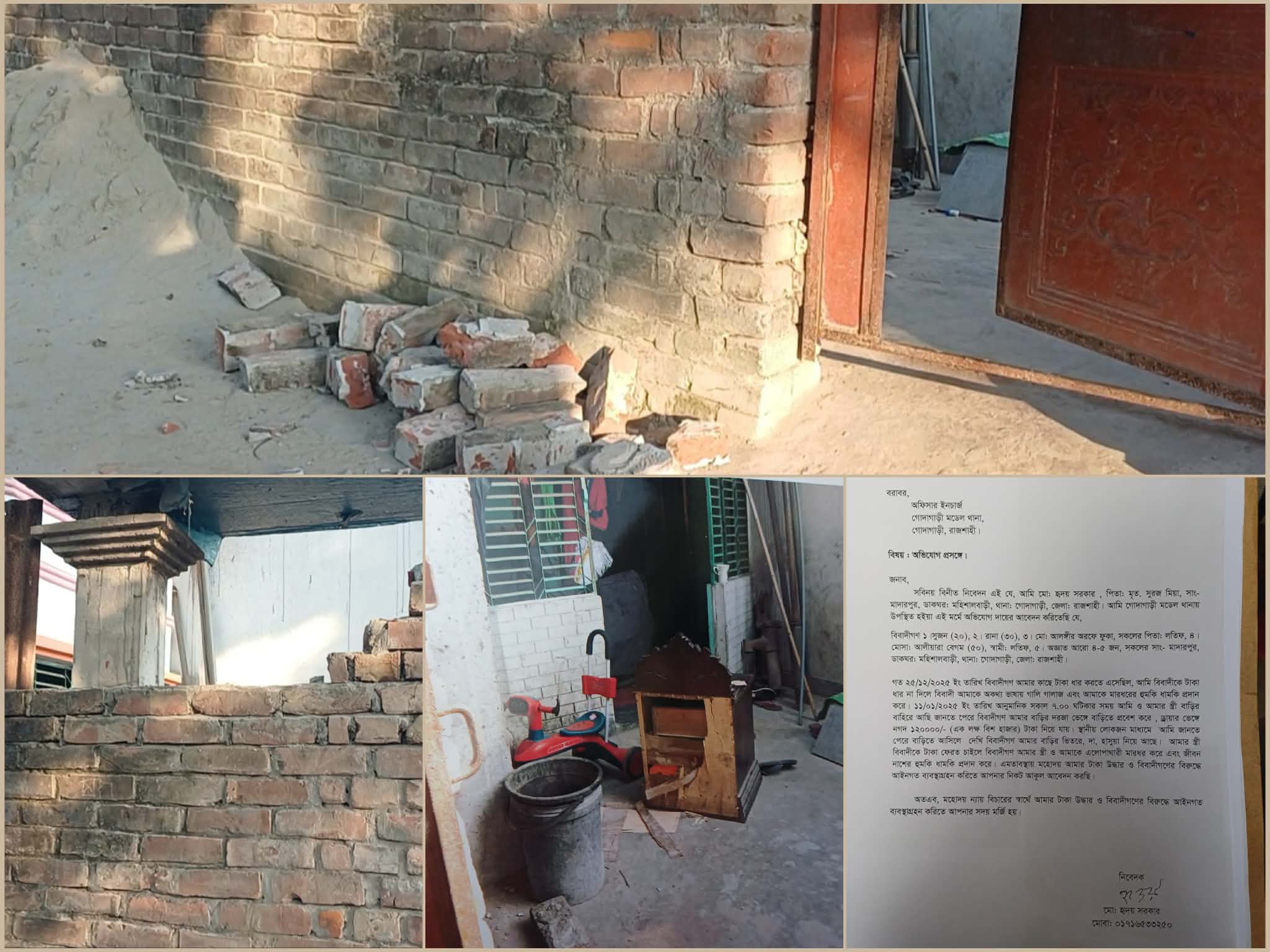 মোঃ রবিউল ইসলাম মিনাল:রাজশাহী জেলা প্রতিনিধি: রাজশাহীর গোদাগাড়ী উপজেলার মাদারপুর গ্রামে টাকা ধার না পেয়ে এক ব্যক্তির বসতবাড়িতে হামলা, ভাঙচুর ও নগদ টাকা লুটপাটের অভিযোগ উঠেছে। গত রবিবার (১১ জানুয়ারি) সকালে এই ঘটনা ঘটে। এ ঘটনায় ভুক্তভোগী মো. হৃদয় সরকার বাদী হয়ে স্থানীয় সুজন ও রানাসহ ৪ জনের নাম উল্লেখ করে এবং অজ্ঞাতনামা আরও ৪-৫ জনের বিরুদ্ধে গোদাগাড়ী মডেল থানায় একটি লিখিত অভিযোগ দায়ের করেছেন।