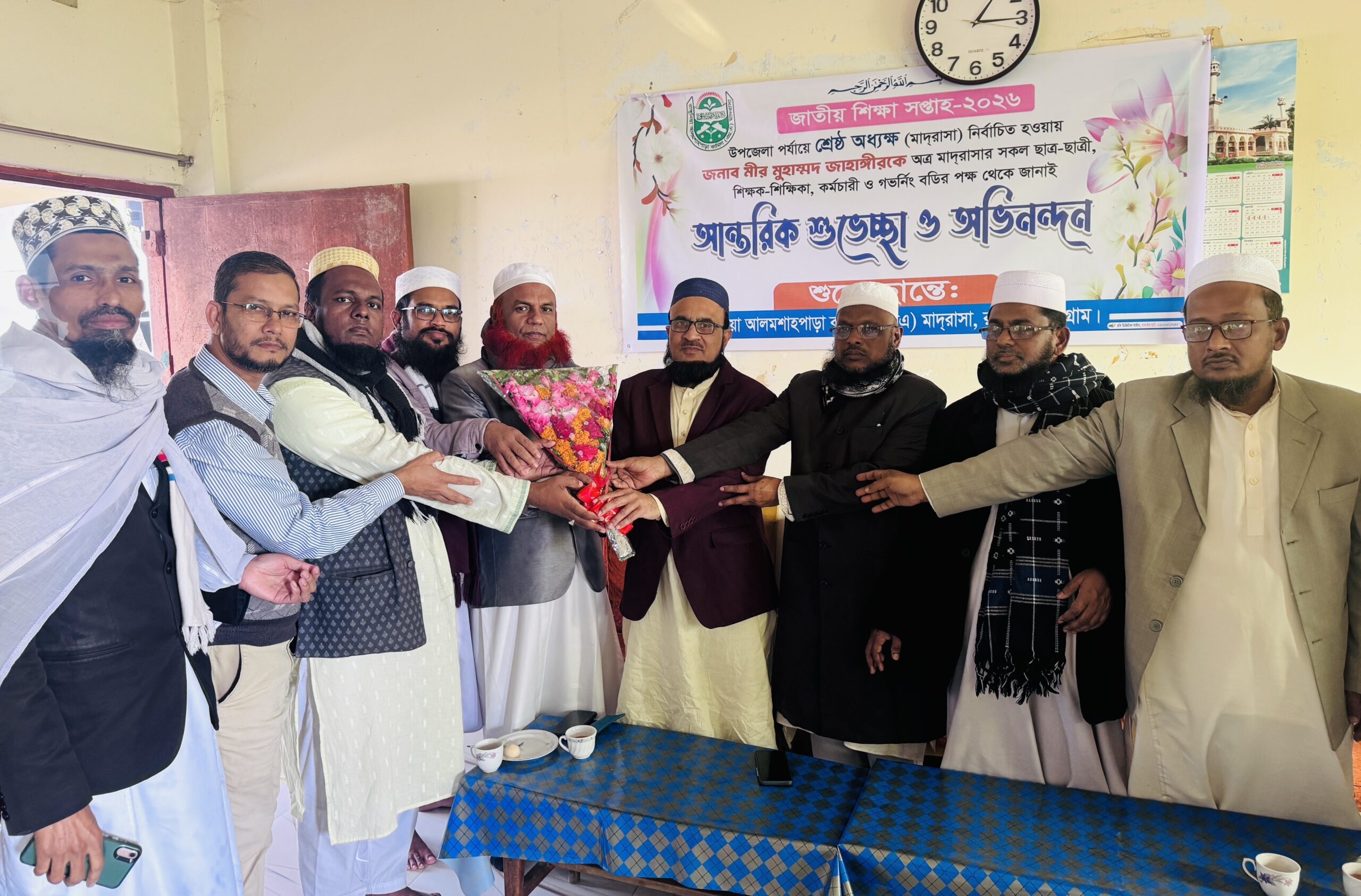 রাঙ্গুনিয়া (চট্টগ্রাম) প্রতিনিধিঃ জাতীয় শিক্ষা সপ্তাহ ২০২৬ইং এ রাঙ্গুনিয়ায় মাদ্রাসা পর্যায়ে শ্রেষ্ঠ প্রতিষ্ঠান প্রধান নির্বাচিত হওয়ায় আলমশাহপাড়া কামিল বিশ্ববিদ্যালয় মাদ্রাসার অধ্যক্ষ মীর মুহাম্মদ জাহাঙ্গীরকে ফুলেল সংবর্ধনা প্রদান করা হয়েছে। বুধবার (১৩ জানুয়ারি) মাদ্রাসার শিক্ষক মিলনায়তনে মাদ্রাসার শিক্ষার্থী, গভর্নিং বডি ও শিক্ষক পরিষদের উদ্যোগে এই সংবর্ধনা অনুষ্ঠানের আয়োজন করা হয়।