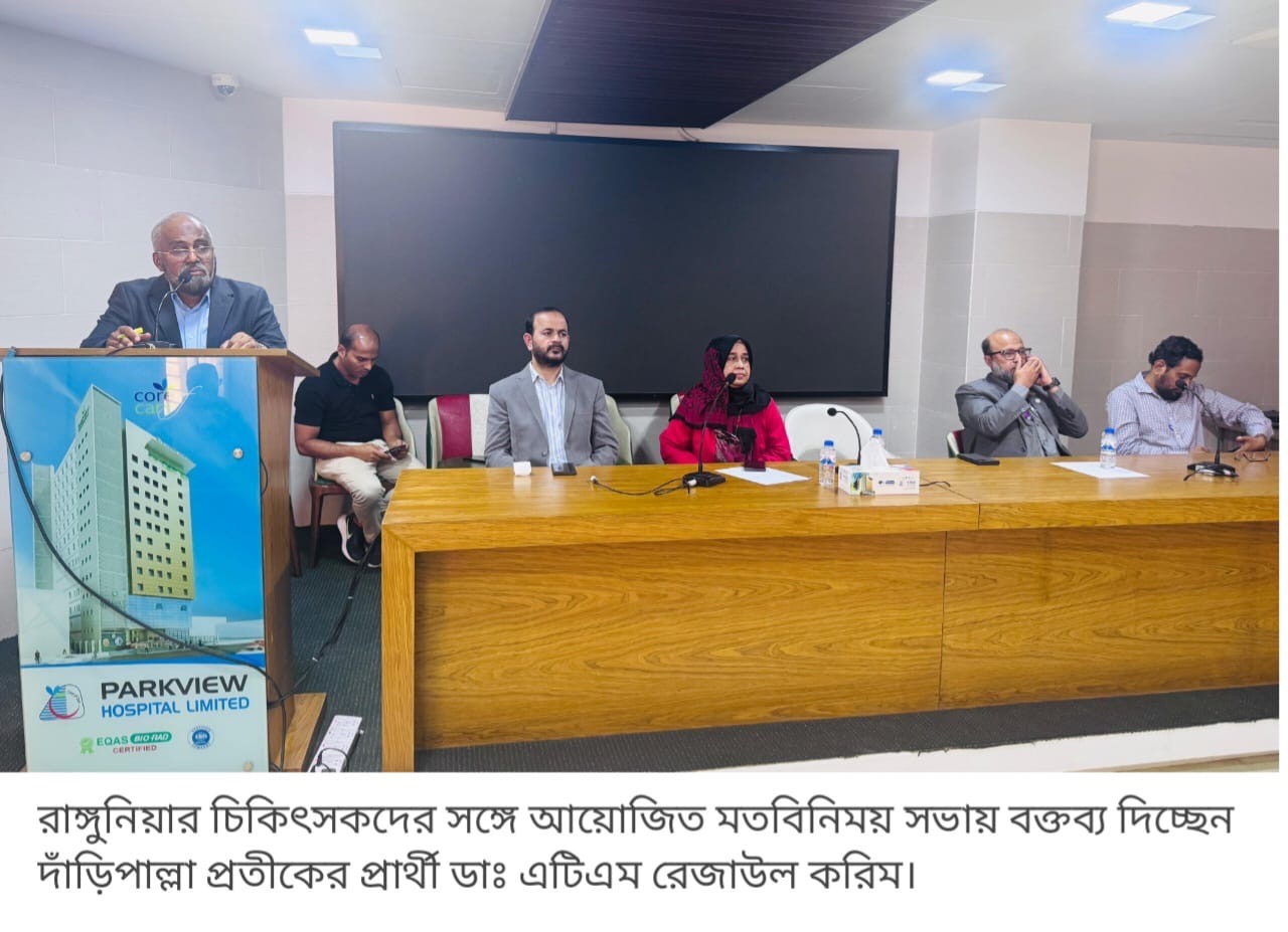 রাঙ্গুনিয়া:চট্টগ্রাম শহরে কর্মরত রাঙ্গুনিয়ার বিভিন্ন চিকিৎসকদের সঙ্গে মতবিনিময় সভা করেছেন রাঙ্গুনিয়া আসনে দাঁড়িপাল্লা প্রতীকের প্রার্থী ডাঃ এটিএম রেজাউল করিম। রোববার (১৮ জানুয়ারি) স্থানীয় একটি হল রুমে এ সভা অনুষ্ঠিত হয়।