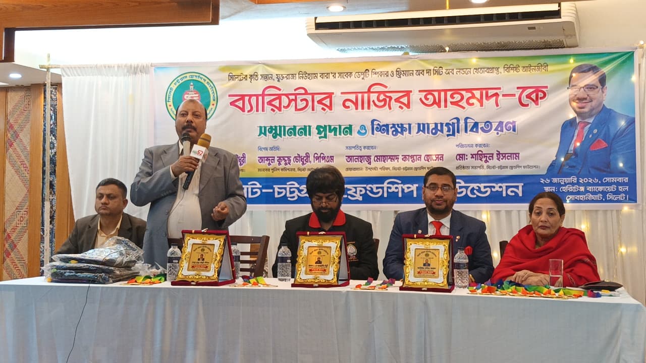 সোমবার ২৬ জানুয়ারি ২০২৬, রাত ৮ টায় সিলেট সোবহানীঘাটস্থ এক অভিজাত হোটেলে সিলেট-চট্টগ্রাম ফ্রেন্ডশিপ ফাউন্ডেশনের উদ্যোগে ব্যারিস্টার নাজির আহমদকে সংবর্ধনা এবং শিক্ষার্থীদের মধ্যে শিক্ষা উপকরণ বিতরণ করা হয়।