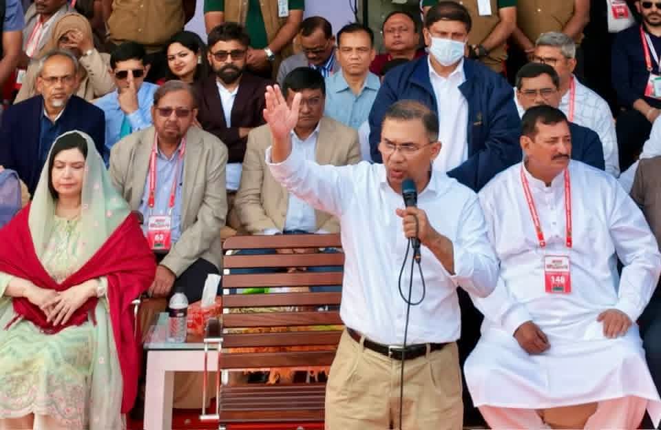 সমাবেশের বক্তবো শেষে তারেক রহমান রাজশাহী, চাঁপাইনবাবগঞ্জ ও নাটোরের ধানের শীষের মনোনিত প্রার্থীদের পরিচয় করিয়ে দিয়ে বলেন ১২ জানুয়ারি পর্যন্ত আপনারা তাদের দেখে রাখবেন ১২ জানুয়ারির পর তারা আপনাদের দেখে রাখবে।