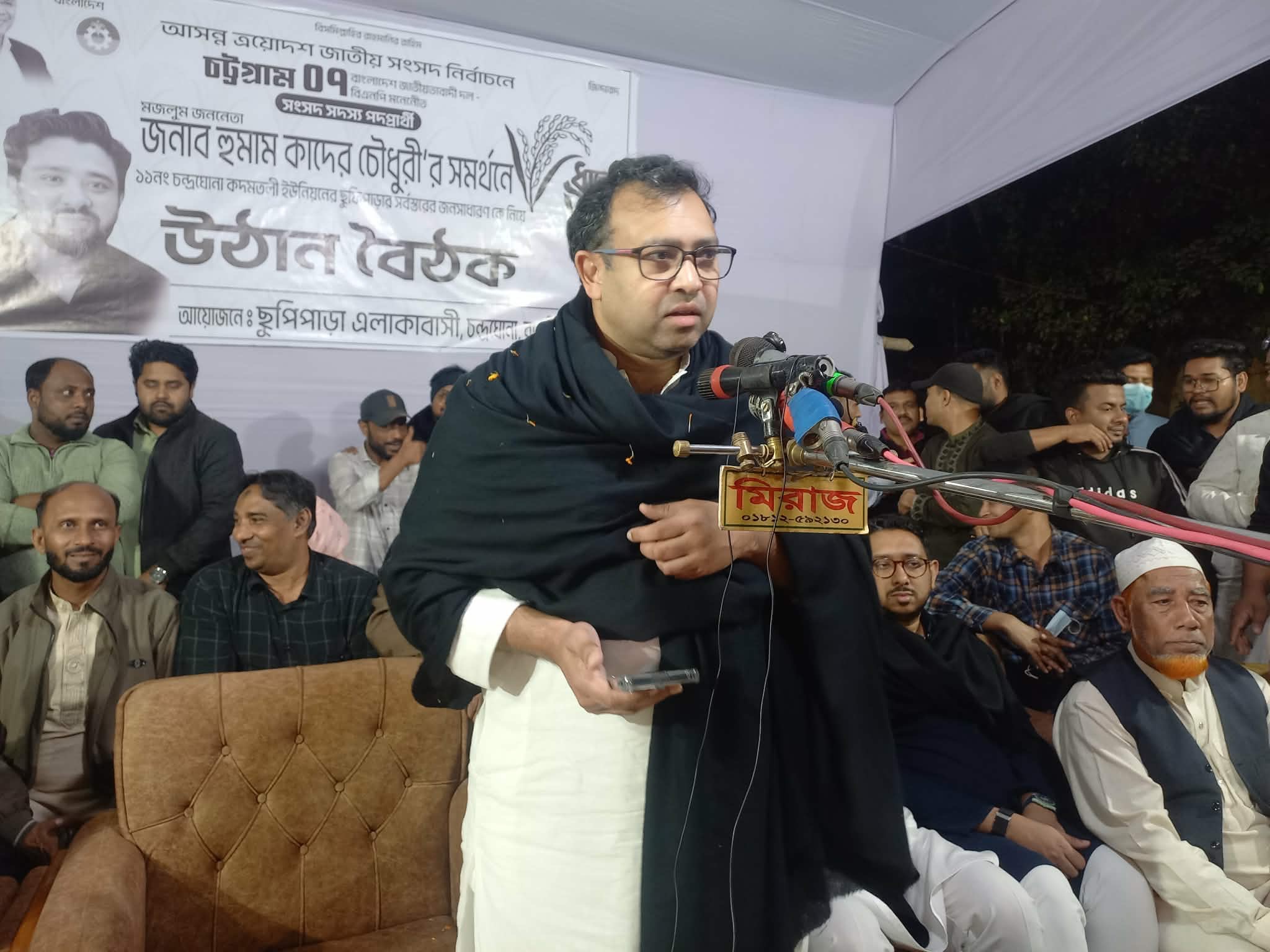 রাঙ্গুনিয়া প্রতিনিধি:রাঙ্গুনিয়া উপজেলার চন্দ্রঘোনা-কদমতলী ইউনিয়নের ছুফিপাড়া এলাকাবাসীর উদ্যোগে ধানের শীষে ভোট চেয়ে নির্বাচনী উঠান বৈঠক রোববার (২ ফেব্রুয়ারী) রাতে অনুষ্ঠিত হয়েছে৷ এতে প্রধান অতিথি হিসেবে বক্তব্য দেন ধানের শীষের প্রার্থী হুমাম কাদের চৌধুরীর বড় ভাই ফয়েজ কাদের চৌধুরী।