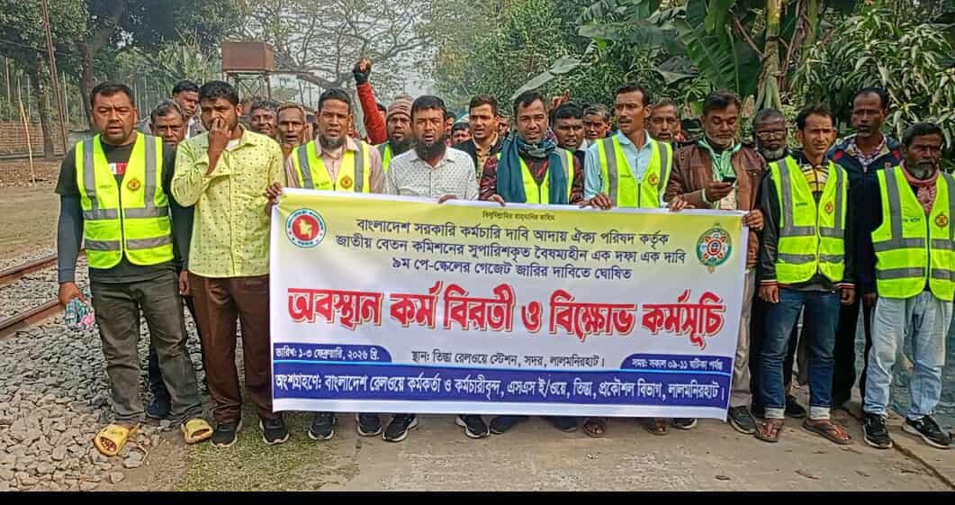 রেখা মনি,রংপুর:জাতীয় বেতন কমিশনের সুপারিশ বাস্তবায়ন, ন্যায্য মজুরি, ৯ম পে-স্কেল প্রদান এবং কর্মসংস্থানের নিরাপত্তার দাবিতে বাংলাদেশ রেলওয়ের অস্থায়ী ও দৈনিক মজুরিভিত্তিক কর্মচারীরা অবস্থান কর্মসূচি ও বিক্ষোভ সমাবেশ পালন করেছেন। দাবি আদায়ে কর্তৃপক্ষ দ্রুত কার্যকর পদক্ষেপ না নিলে আগামী দিনে আরও কঠোর আন্দোলনের কর্মসূচি ঘোষণার হুঁশিয়ারি দেন আন্দোলনকারীরা।