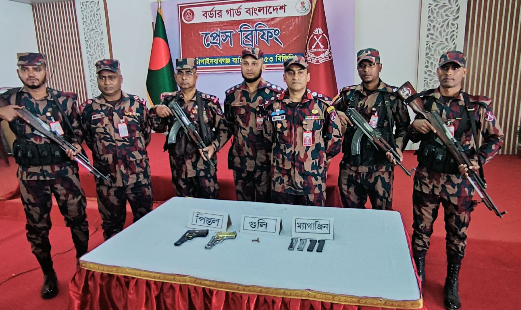 ২০২৬ তারিখ ভোর আনুমানিক ৫টা ৩০ মিনিটে মাসুদপরু বিওপি’র একটি চৌকষ টহলদল সীমান্ত হতে প্রায় ২০০ গজ বাংলাদেশের অভ্যন্তরে চাঁপাইনবাবগঞ্জ জেলার শিবগঞ্জ থানাধীন মনাকষা ইউনিয়নের ঠুঠাপাড়া এলাকায় একটি বিশেষ অভিযান পরিচালনা করে ২টি বিদেশি পিস্তল, ৪টি ম্যাগাজিন ও ৩ রাউন্ড গুলি
