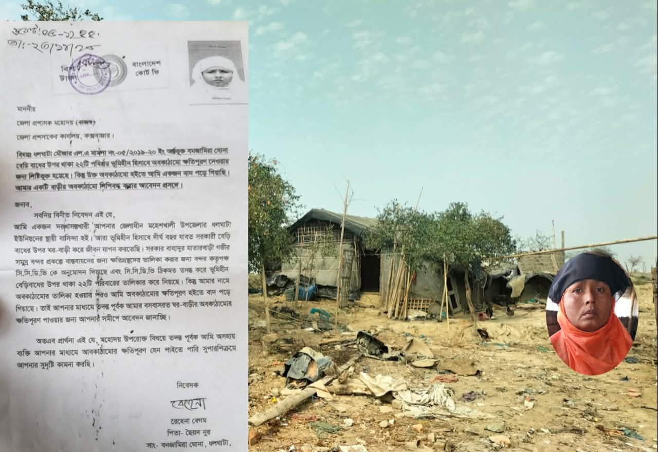 রেহেনা বেগম আরও বলেন, দীর্ঘদিন ধরে তিনি সরকারি বেড়িবাঁধের ওপর বসবাস করে আসছেন এবং তার বসতঘরের অবকাঠামোও জরিপে অন্তর্ভুক্ত করা হয়েছিল। কিন্তু পরবর্তীতে চূড়ান্ত তালিকা থেকে তার নাম বাদ পড়ে যায়।