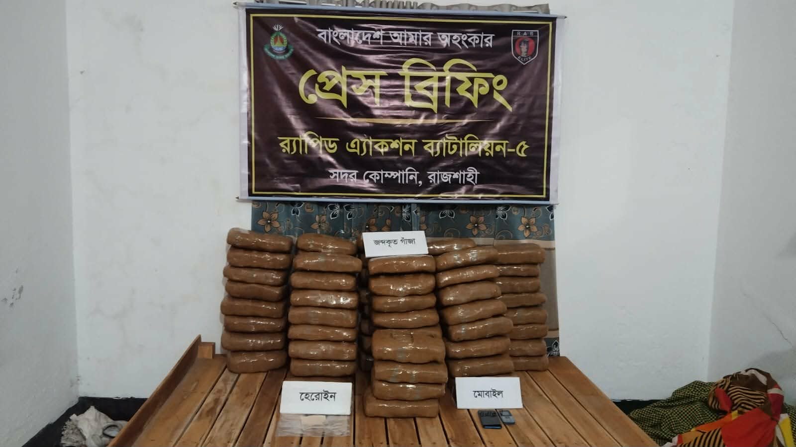 র্যাব জানায়, গোপন সংবাদের ভিত্তিতে র্যাব-৫ রাজশাহীর সদর কোম্পানির একটি চৌকস দল মঙ্গলবার বিকেল সাড়ে ৫টার দিকে শাহমখদুম থানাধীন সন্তোষপুর গ্রামের জনৈক সামসুল আলমের ভাড়া বাসায় অভিযান চালায়। তল্লাশিকালে বাসাটি থেকে ১৩৬ কেজি গাঁজা ও ১৭ গ্রাম হেরোইন উদ্ধার করা হয়। এসময় মাদক কেনাবেচার কাজে ব্যবহৃত ৩টি মোবাইল ফোন ও ৪টি সিম কার্ড জব্দ করা হয়।