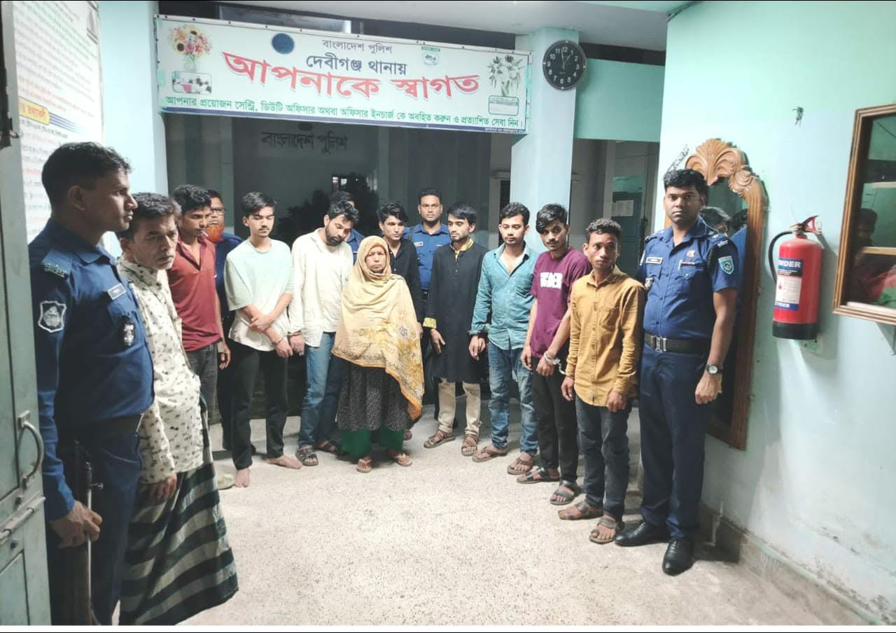 গ্রেফতারকৃতদের মধ্যে রয়েছেন ভাউলাগঞ্জ এলাকার তহমিনা বেগম (৭৫), তার ছেলে মো. হানিফ (৪৪) এবং নাতি মো. মিস্টার আলী (২৩)। এছাড়াও নীলফামারীর ডোমার উপজেলার শব্দিগঞ্জ এলাকার মো. হানিফ (২৪) ও জহুরুল ইসলাম (৩২), দেবীগঞ্জ উপজেলার টোকরাভাষা এলাকার জিয়াউর রহমান (২৬), ভাউলাগঞ্জ এলাকার রনি ইসলাম (২৪), সুমন ইসলাম (২২), তৌকির আলম (৩৪), কমল রায় (২৫), বোদা উপজেলার নুরপুর এলাকার রাগিব ইয়াসার (২২) ও মামুনুর রশিদ (৩০) রয়েছেন।
