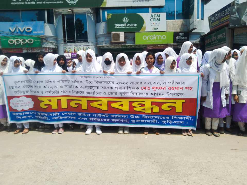 জানাগেছে, ২০২২ সালের দিনাজপুর শিক্ষা বোর্ডের এসএসসি পরীক্ষার প্রশ্নপত্র ফাঁসের ঘটনায় জড়িত থাকার অভিযোগে কুড়িগ্রামের ভুরুঙ্গামারী নেহাল উদ্দিন পাইলট বালিকা উচ্চ বিদ্যালয়ের সাময়িকভাবে বরখাস্তকৃত সাবেক প্রধান শিক্ষক মোঃ লুৎফর রহমানসহ সংশ্লিষ্ট ৭ শিক্ষক-কর্মচারীদের পুনর্বহাল না করার দাবিতে শিক্ষক,শিক্ষার্থী ও অভিভাবকদের এ মানববন্ধন অনুষ্ঠিত হয়|