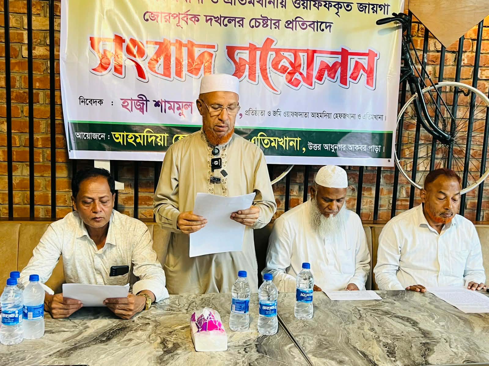সংবাদ সম্মেলনে লিখিত বক্তব্য রাখেন উত্তর আধুনগর আকবর পাড়া আহমদিয়া হেফজখানা ও এতিমখানার প্রতিষ্ঠাতা ও জায়গা ওয়াকফ দাতা হাজী সামশুল ইসলাম।