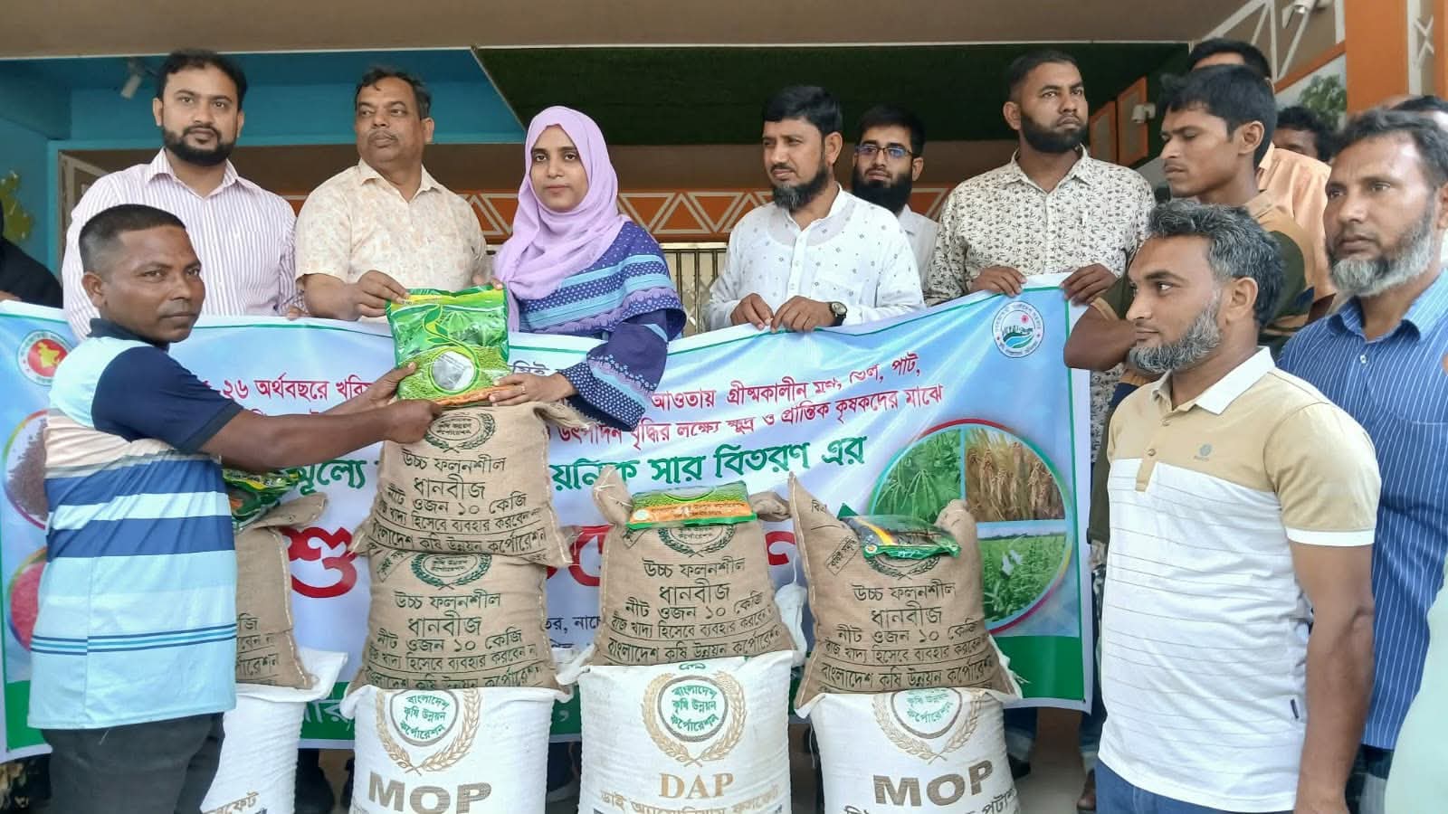 বৃহস্পতিবার ১৬ এপ্রিল সকাল সাড়ে ১০ টার দিকে উপজেলা চত্বরে আয়োজিত এক অনুষ্ঠানে কৃষকদের হাতে উন্নত জাতের বীজ এবং ডিএপি ও এমওপি সার তুলে দেওয়া হয়। কৃষি অফিসের তথ্যানুযায়ী, বিভিন্ন ফসল ভেদে বিতরণের মাত্রা ছিল, আউশ ধান কৃষক প্রতি ৫ কেজি বীজ, ১০ কেজি ডিএপি এবং ১০ কেজি এমওপি সার। পাট ১ কেজি বীজ, ১০ কেজি ডিএপি এবং ৫ কেজি এমওপি সার। মুগ ডাল ৫ কেজি বীজ, ১০ কেজি ডিএপি এবং ৫ কেজি এমওপি সার। তিল ১ কেজি বীজ, ১০ কেজি ডিএপি এবং ৫ কেজি এমওপি সার।