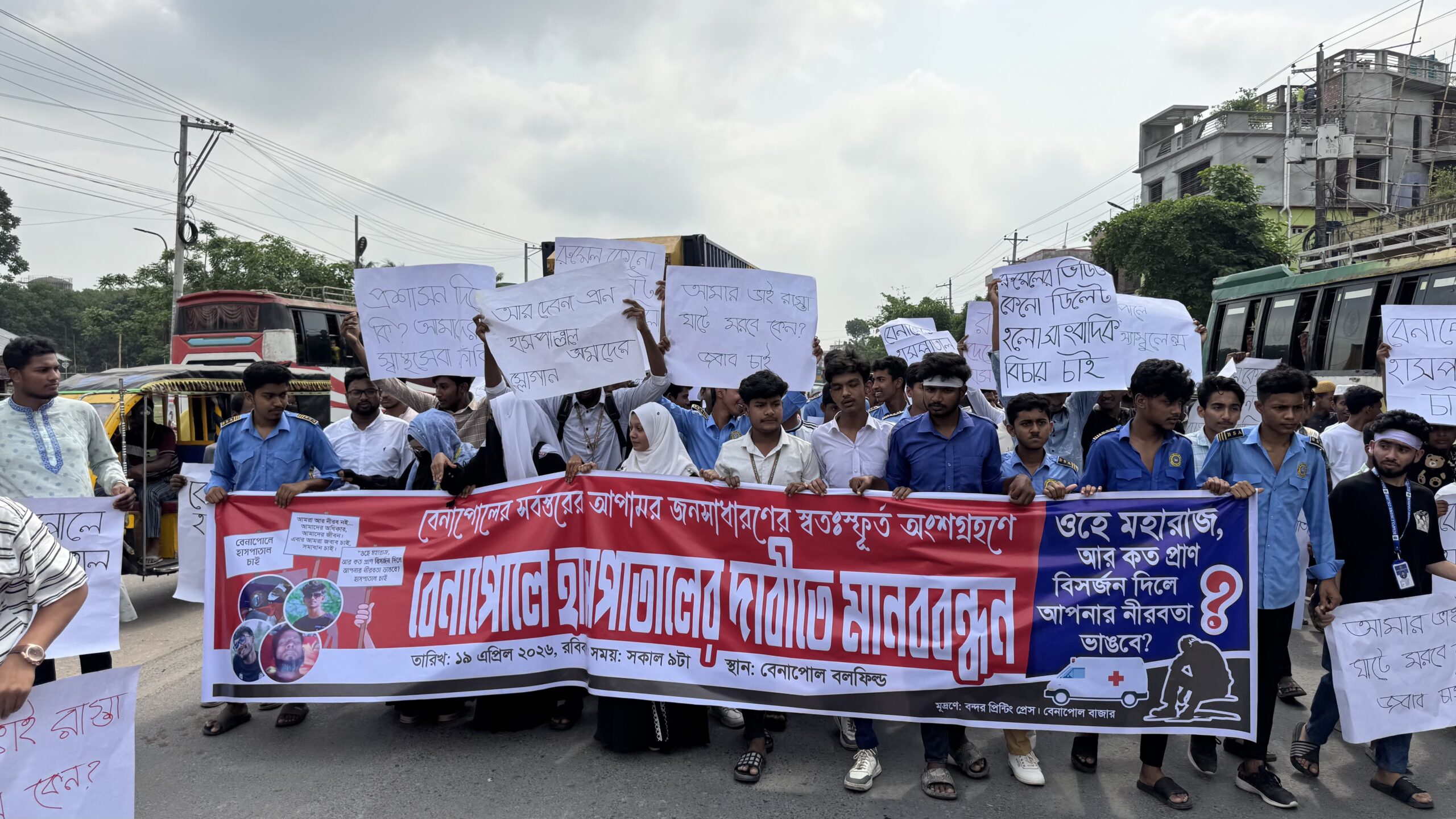 বেনাপোলে হাসপাতালের দাবিতে বিক্ষোভ সমাবেশ, মানববন্ধনের পর সড়ক অবরোধ