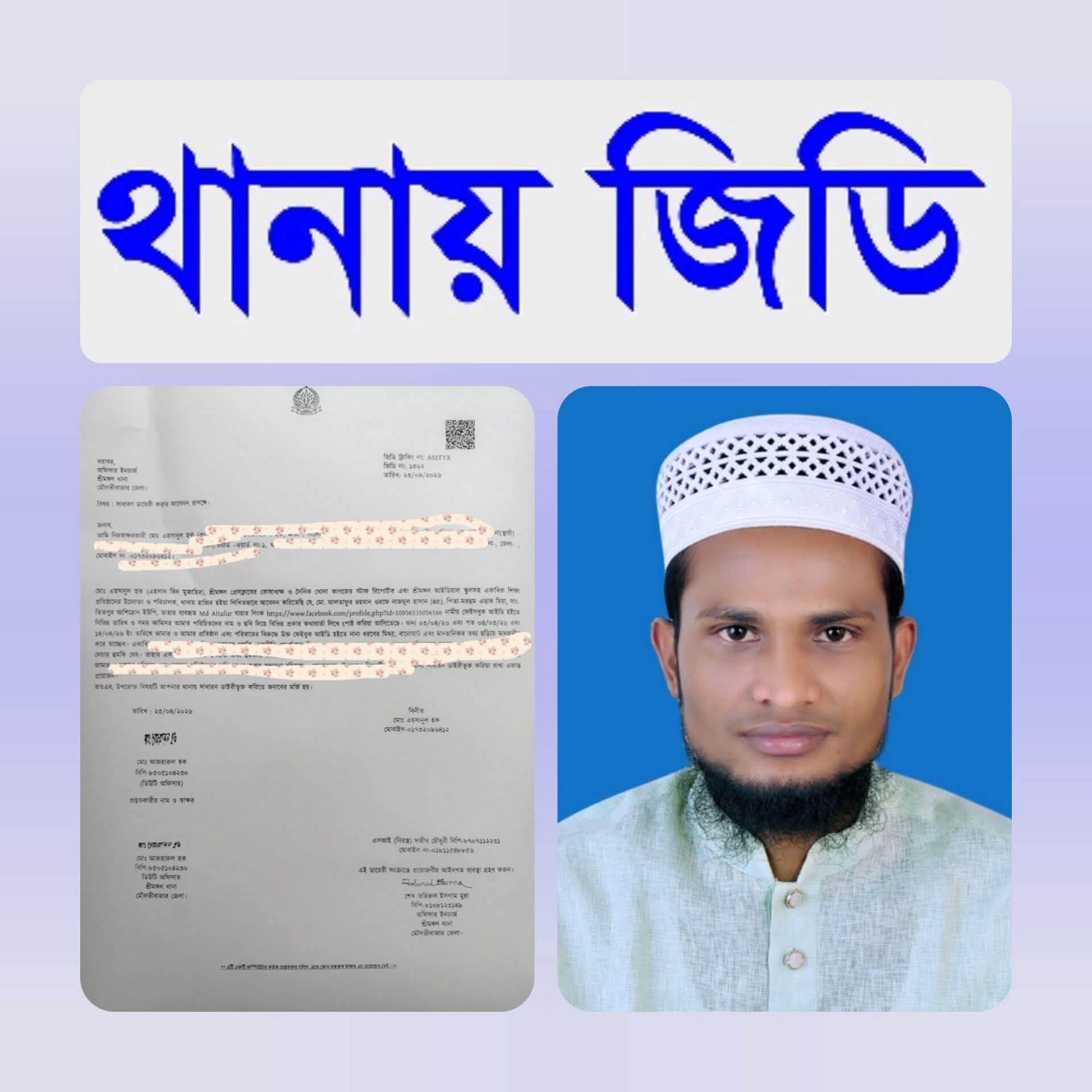 জিডিতে উল্লেখ করা হয়, শ্রীমঙ্গল উপজেলার ৬ নং আশিদ্রোন ইউনিয়নের তিতপুর গ্রামের বাসিন্দা মৃত ইছাক মিয়ার ছেলে মোঃ আলতাফুর রহমান ওরফে নাজমুল হাসান, যার ফেসবুক আইডি (Md. Altafur)। তার নিজ নামীয় ফেসবুক আইডি থেকে উদ্দেশ্যমূলকভাবে সাংবাদিক মো. এহসানুল হক এবং তার শিক্ষা প্রতিষ্ঠানের বিরুদ্ধে অসত্য তথ্য ও মানহানিকর পোস্ট ছড়াচ্ছেন।